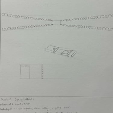 The collection was created using silver as the base metal, with wooden elements CNC-engraved for precision. The lattice-inspired earrings were developed in CAD, while the remaining six pieces—including earrings, long pendant, keychain, bracelet, choker, and hair pin—were entirely handcrafted with careful attention to detail and accuracy.