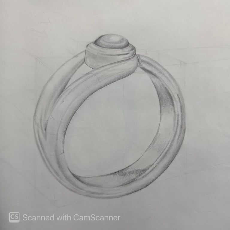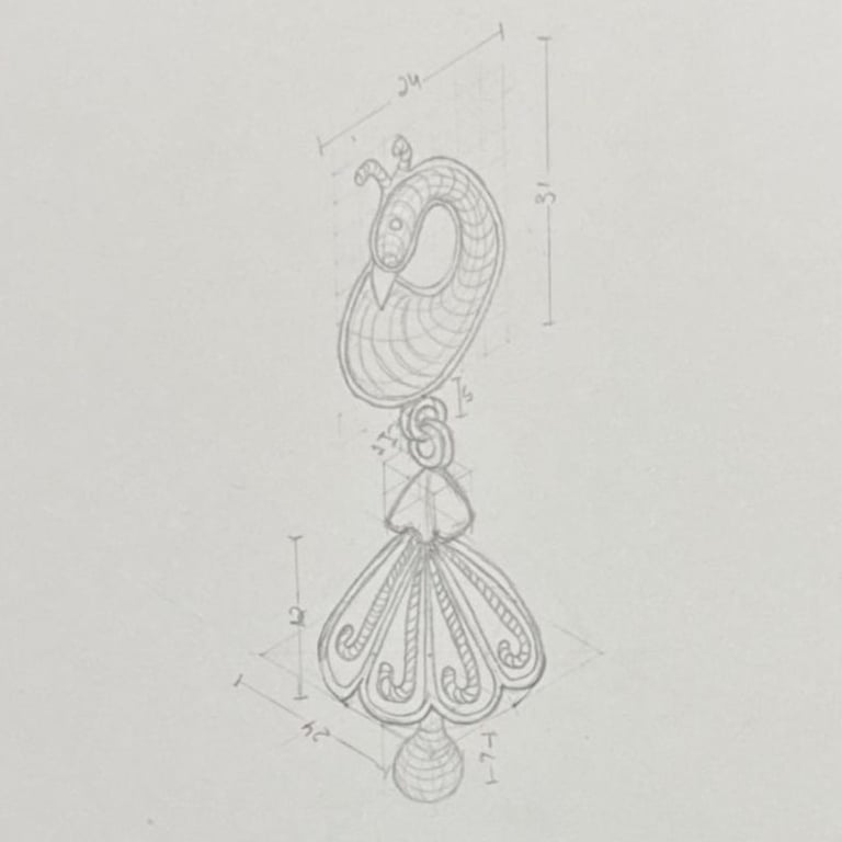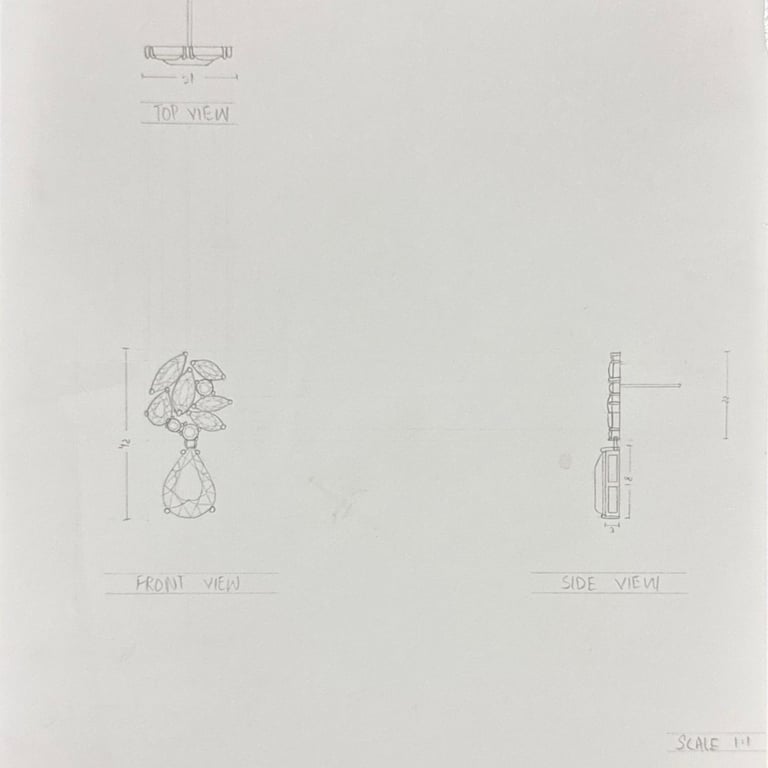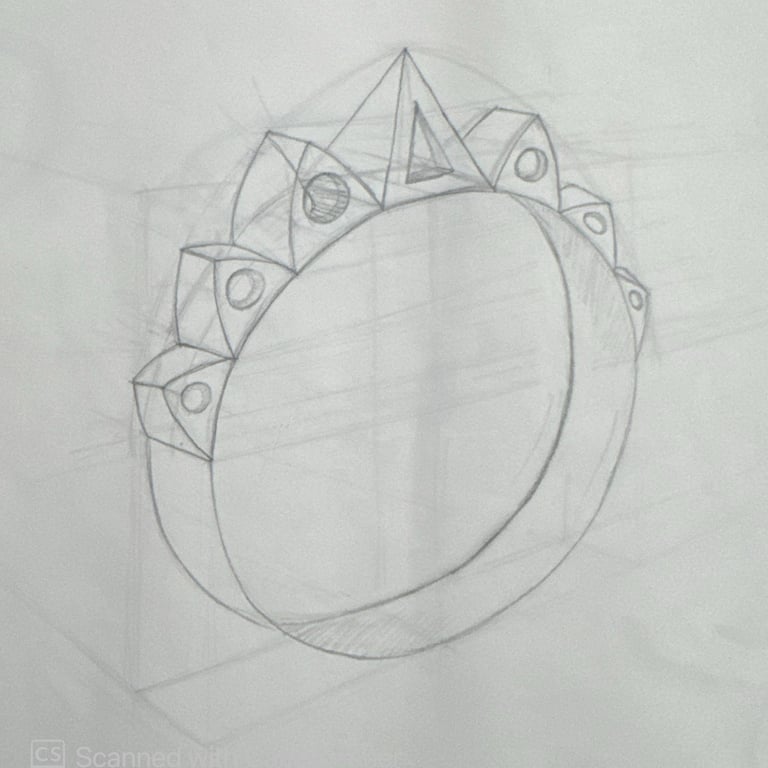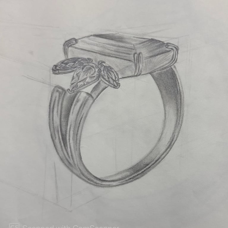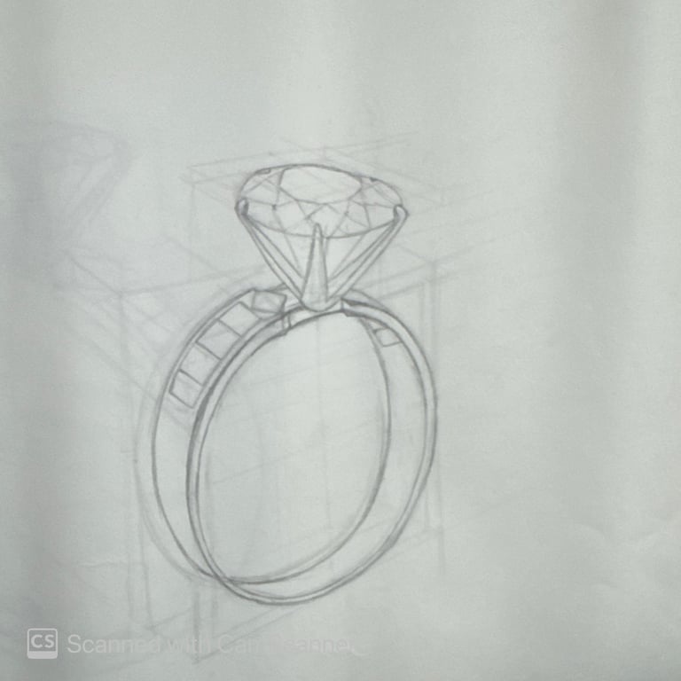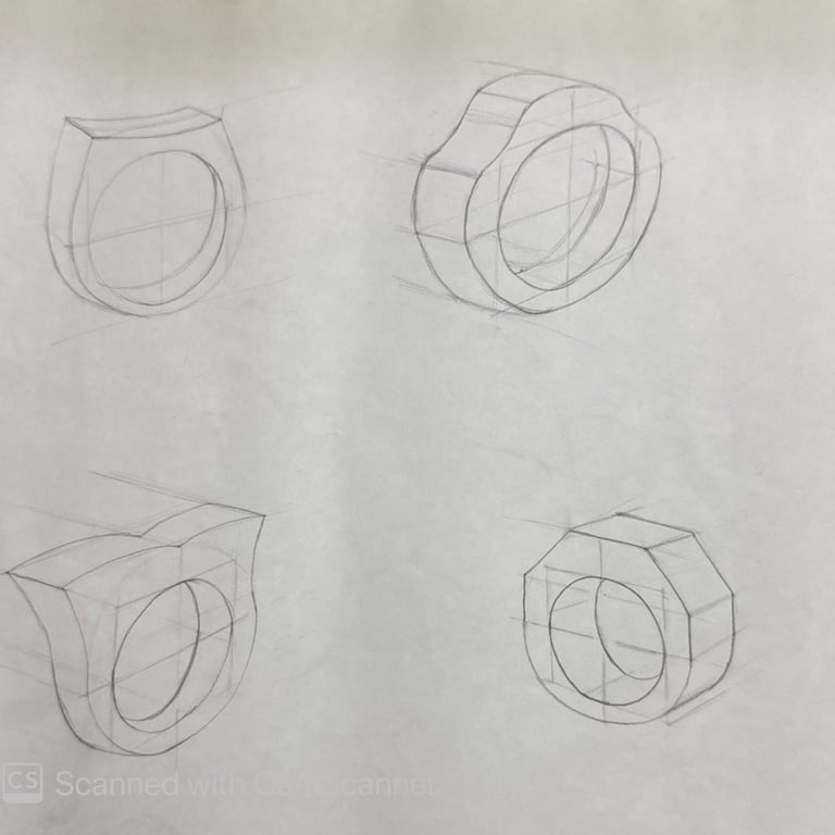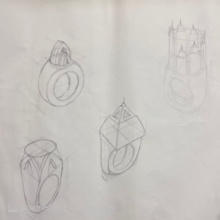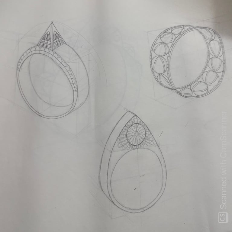 These pencil sketches document the exploration of gemstones, various settings, jewelry forms viewed from multiple angles, and metal structures as part of the design development process.