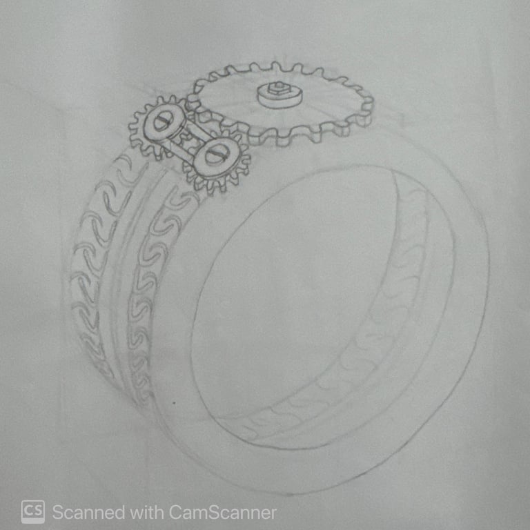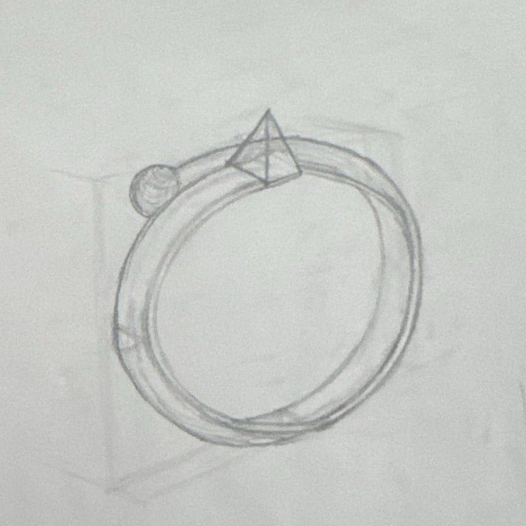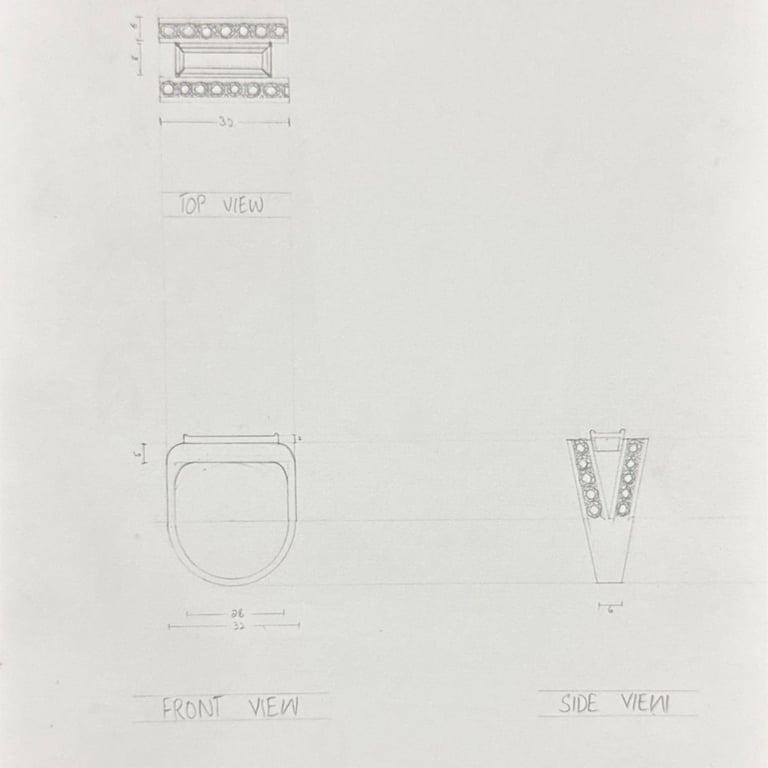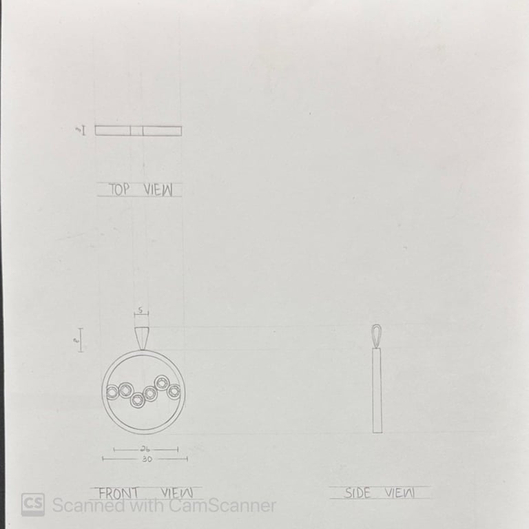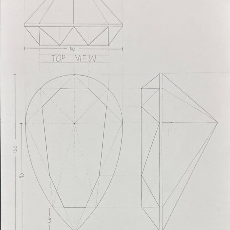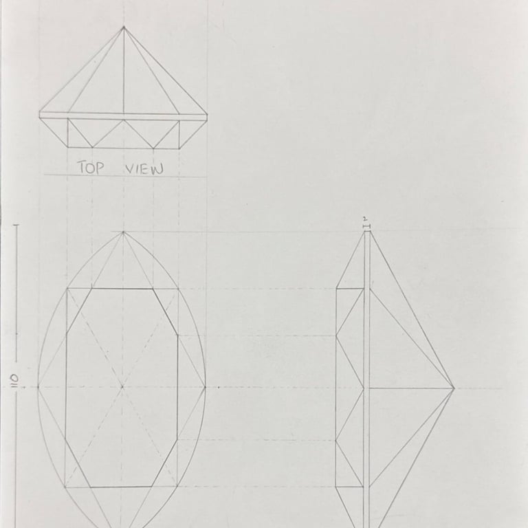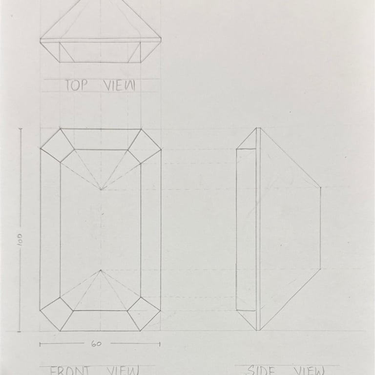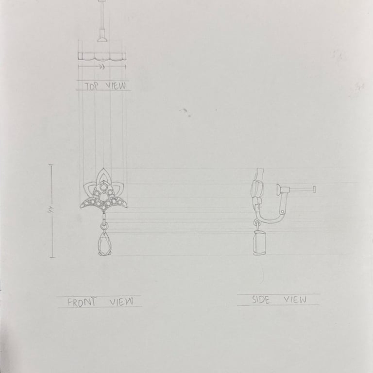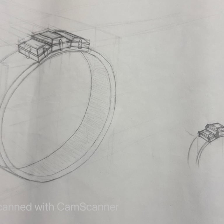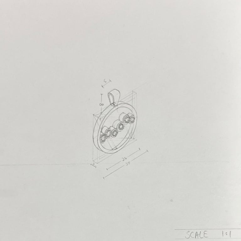 These pencil sketches document the exploration of gemstones, various settings, jewelry forms viewed from multiple angles, and metal structures as part of the design development process.